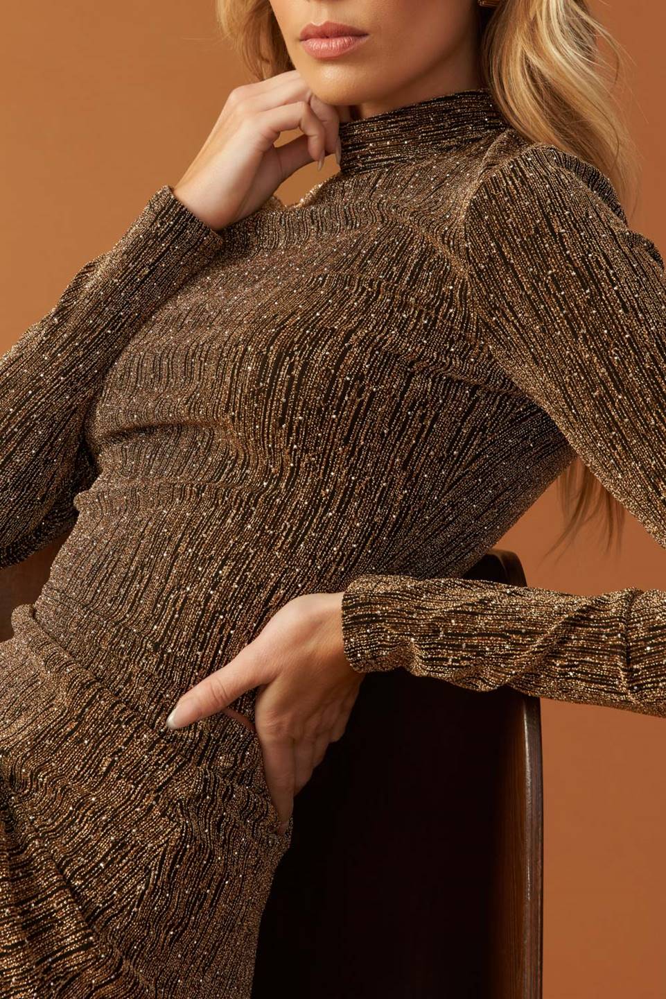 An embellished fabric top and skirt set featuring mock neckline, long sleeve, back neck button closure. Elasticized waist skirt with front slit