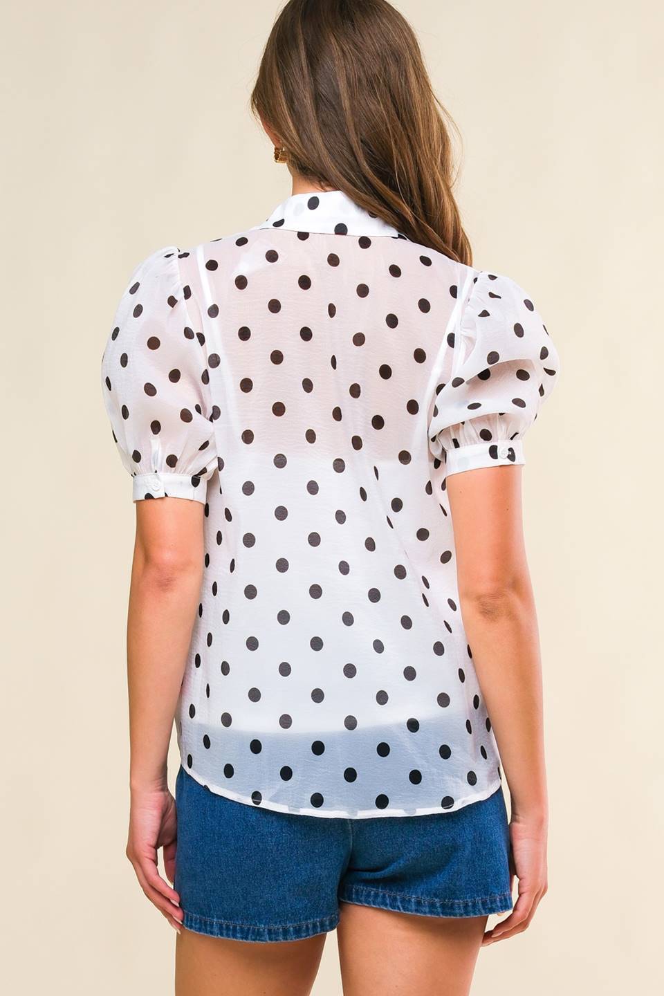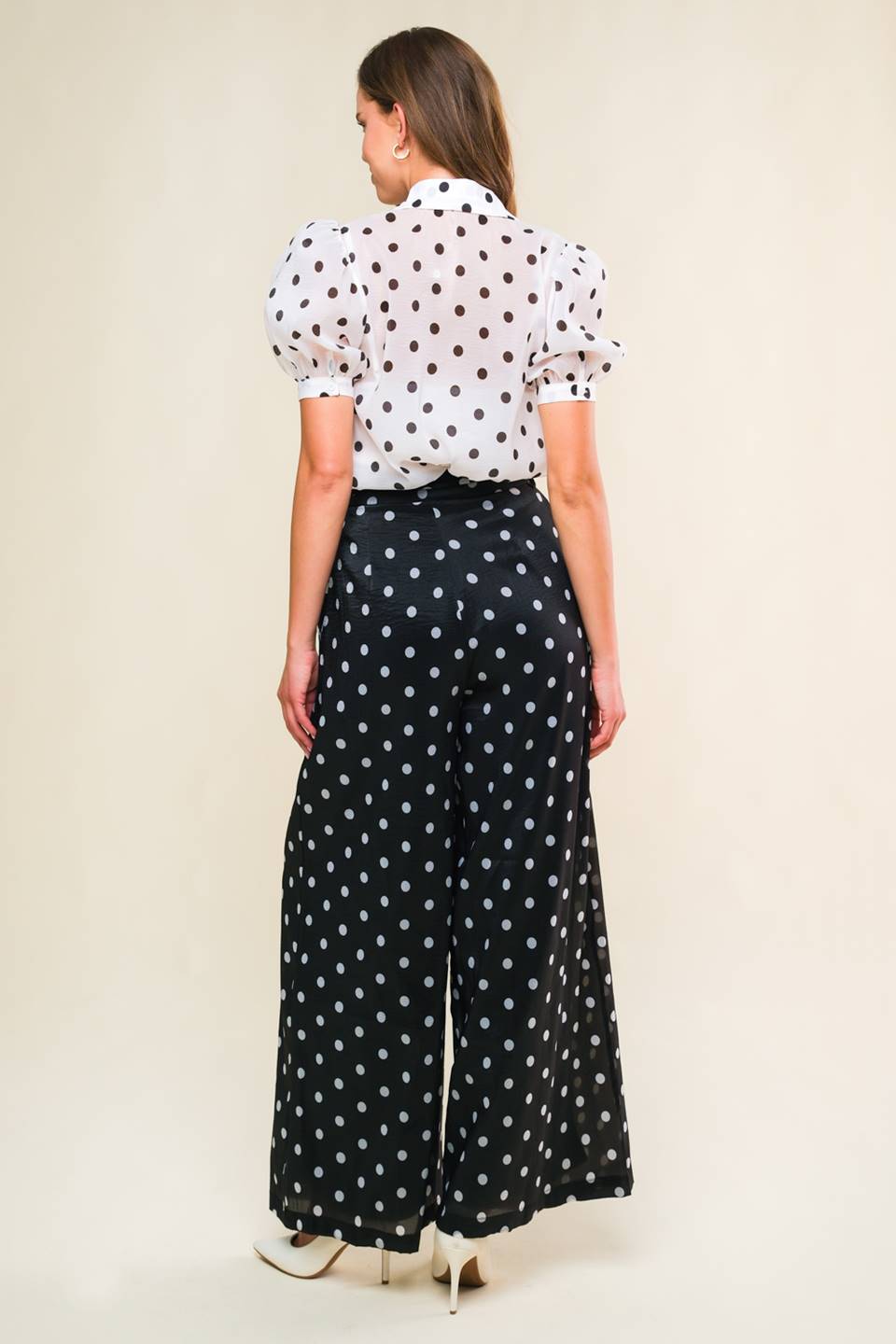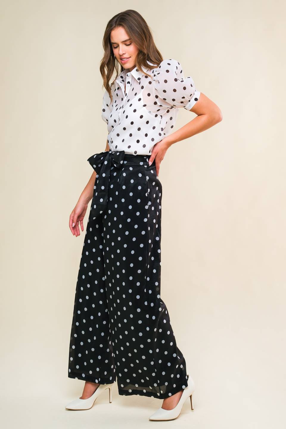 A printed woven top featuring shirt collar, button down, short puff sleeve and cami. Matching pant IP8593
