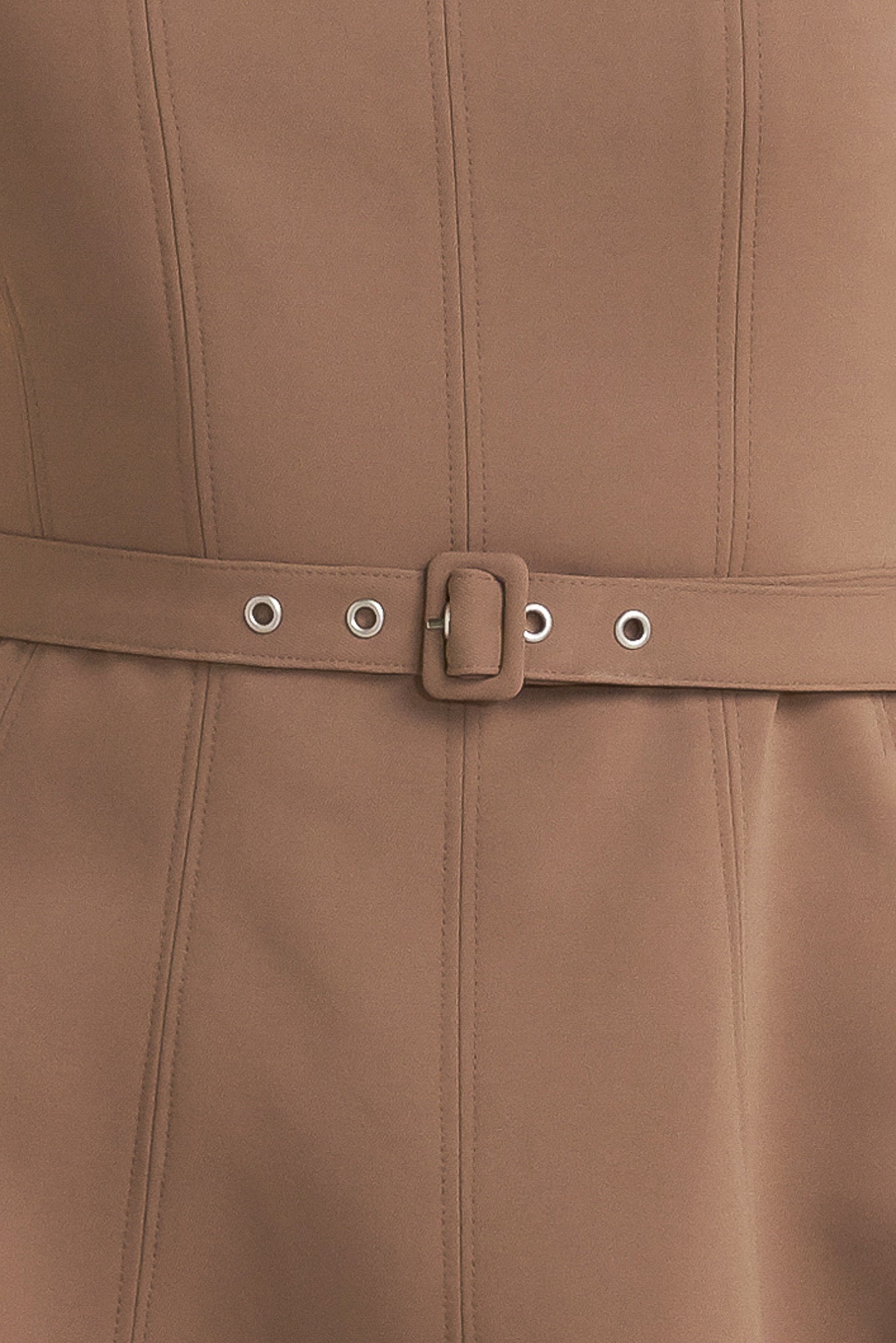 A solid woven midi dress featuring boat neckline, sleeveless, full skirt, self belt, side pocket and full skirt